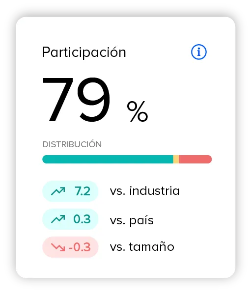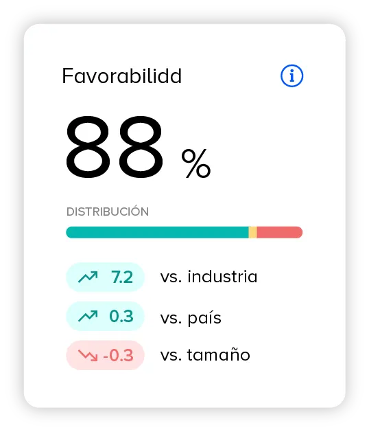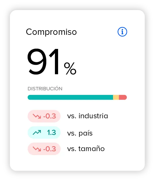 Obtén un diagnóstico claro en tres indicadores clave: Compromiso, Favorabilidad, eNPS, y 11 dimensiones, y compáralos con organizaciones de tu industria, país y tamaño.